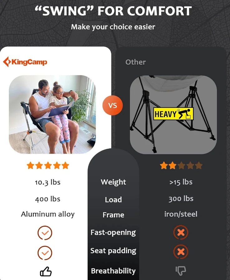Ulkoilma -tuoli on 37,8 "x27.1" x49.2 ", sinulla on tilava istuinalue heilua rajoittamattomana ja korkea selkänoja voi tukea selkääsi. 22.8" Maasta, keinuleirin tuoli on täydellinen aikuisten venyttämiseen jalat vapaasti.