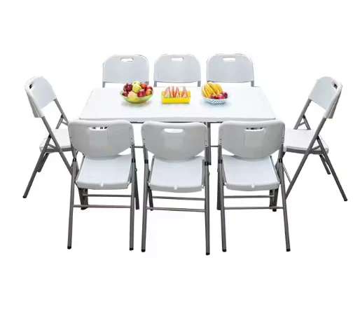 Korkealaatuinen ulkoilmapöytä, valkoinen HDPE: n valkoinen suorakulmainen piknikpöytä muovinen taitettu ulkotilojen leirintäpöytä, joka tarjoaa tilavaa tilaa ruokien, jälkiruokien, juomien tai välipalojen pitämiseen. Taloon liittyy noin 8 ihmistä kokoontumaan perheaineen tai juhlallisen illalliselle. Ja kaikki pöydän yläosat on pyöristetty vahingossa tapahtuvan vamman estämiseksi.