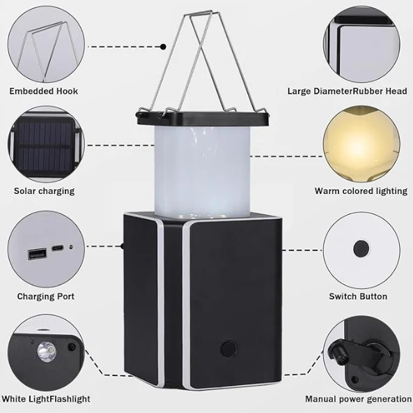 IPX4, Hätävalot käsikampanjan sähköntuotanto, matkapuhelintoiminto matkapuhelimen virransyöttöön, hätävalot, taskulamput, SOS-varoitusvalot., Aurinkoenergian LED-ladattava hätäleirin lyhty, aurinko ladattava, ladattava tyyppi C,