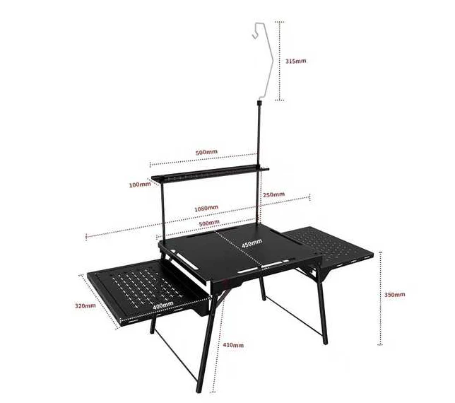 Kannettava taitettava alumiini-rautaleirintäpöytä, ruokapöytälaite koostuu ylemmästä, keskimmäisestä ja alaosasta, riittävästi tilaa kaikenlaisten astioiden, ruoan ja mausteiden varastointiin.