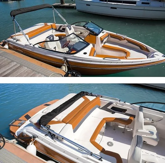 Ruostumaton veneen bimini, joka on valmistettu merenluokan 600D -polyesterikankaalla, jossa on kaksinkertainen PU -päällyste, säilytyskenkä tarjoaa hyvän suojaa auringonvalolta, merivettä, sadetta ja pölyä.